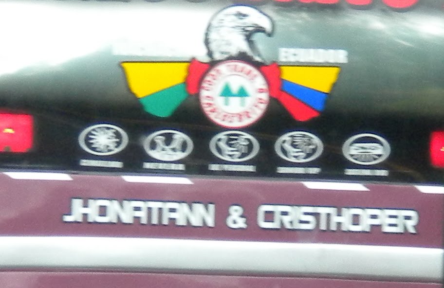The tenuous link there was that I was a bit late getting going for having to deal with the CSA long-distance style on my morning of departure for Sangay National Park. So... brave the first of two Pick-pocket Rockets (or as the locals call them the Ecovia and Trole express buses). Travel a good hour out to the south bus terminal. Take a bus to Riobamba. In Ecuador`s bus system you can`t pay more to get a better service. The buses are reasonably comfortable but have no air-conditioning or toilets. The driving is OK compared to other South American situations I`ve been in, but the most annoying thing is the constant stopping to pick up more people. So you can be guaranteed of a over-full bus for the entire journey. They let on children up to about the age of 8 without a ticket, who then occupy seats until they have to sit on parents` laps. People including our mobile salesmen friends clog the aisles and make it quite uncomfortable at times for full fee paying sitters. Just my spit, to let you know. Not really that bad. He he, one rica (rich woman) paid for a seat (and whole ice-cream) for her pedigree Scottish terrier. Funny. Also funny is the photo of the back of another bus with some rather intersting versions of the names `Jonathan and Christopher`.